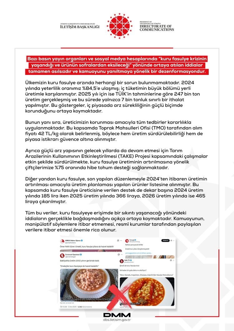 Açıklamanın sonunda DMM, kuru fasulyeye erişimde sıkıntı yaşanacağı iddialarının gerçeği yansıtmadığını belirterek, kamuoyunun manipülatif içeriklere karşı dikkatli olması ve resmi verileri esas alması çağrısında bulundu.
