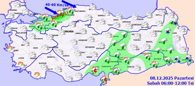 ANKARA (İGFA) – Meteoroloji Genel Müdürlüğü, 8 Aralık Pazartesi gününe ilişkin hava tahmin raporunu yayımladı.