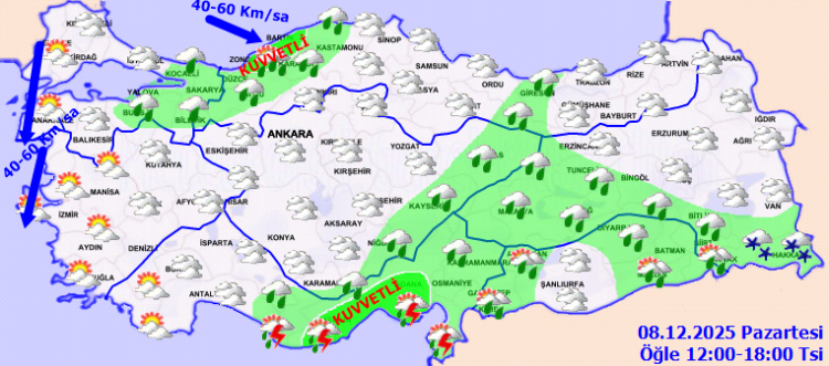 Yağışların Batı Karadeniz kıyıları ile Mersin ve Adana çevrelerinde kuvvetli olması öngörülürken, hava sıcaklıkları batı ve iç kesimlerde mevsim normallerinde, diğer bölgelerde ise birkaç derece üzerinde seyretmesi bekleniyor. Rüzgârın ise Marmara’nın kuzeyi, Batı Karadeniz ve Ege kıyılarında kuzeyli yönlerden 40–60 km/saat hızla kuvvetli eseceği bildirildi.